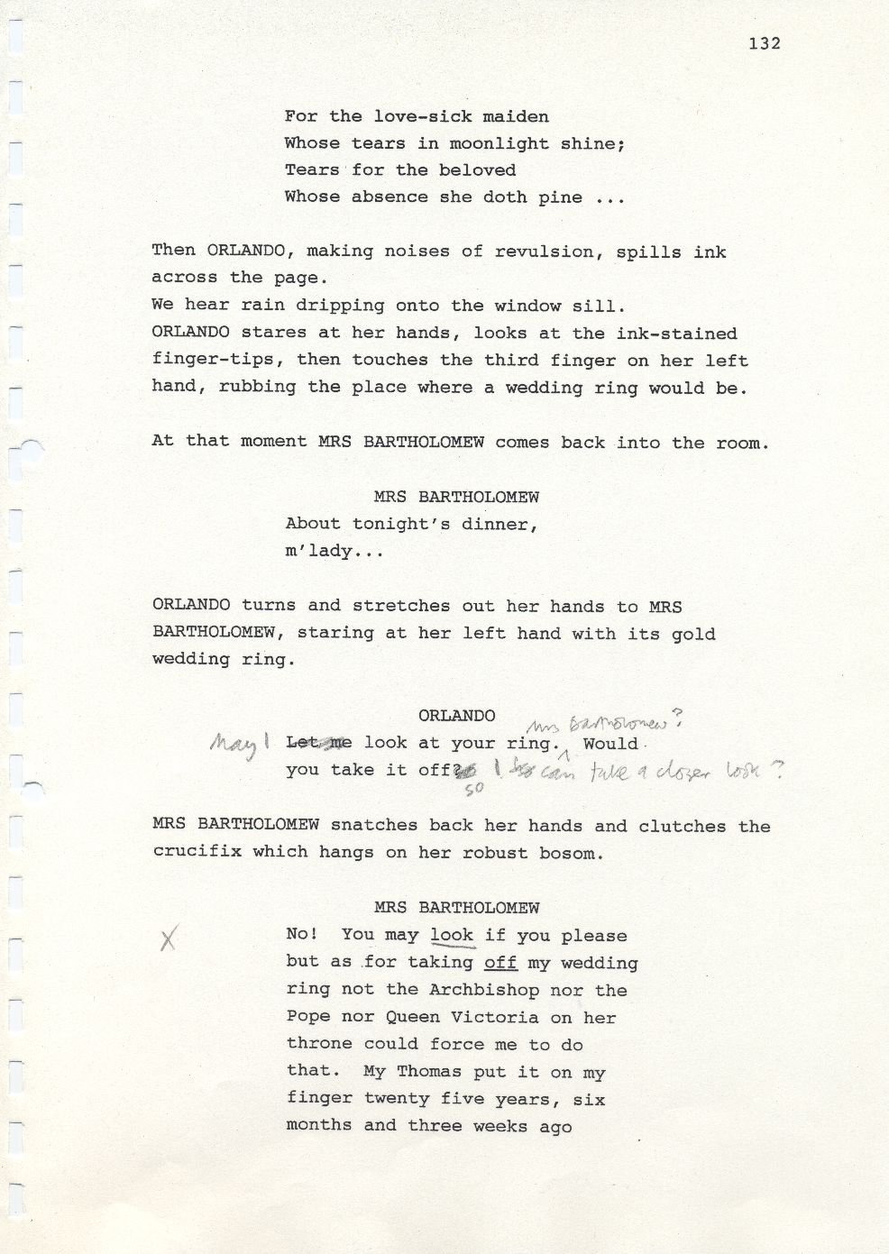 Description Page 132 of second draft script for Orlando. Black printed text with pencil annotations on A4 paper bound with a plastic comb spine.