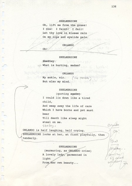 Description Page 136 of second draft script for Orlando. Black printed text with pencil annotations on A4 paper bound with a plastic comb spine.