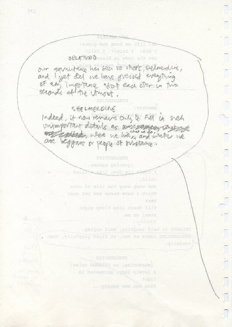 Description Reverse of page 136 of second draft script for Orlando. Handwritten script with pencil on A4 paper bound with a plastic com spine,