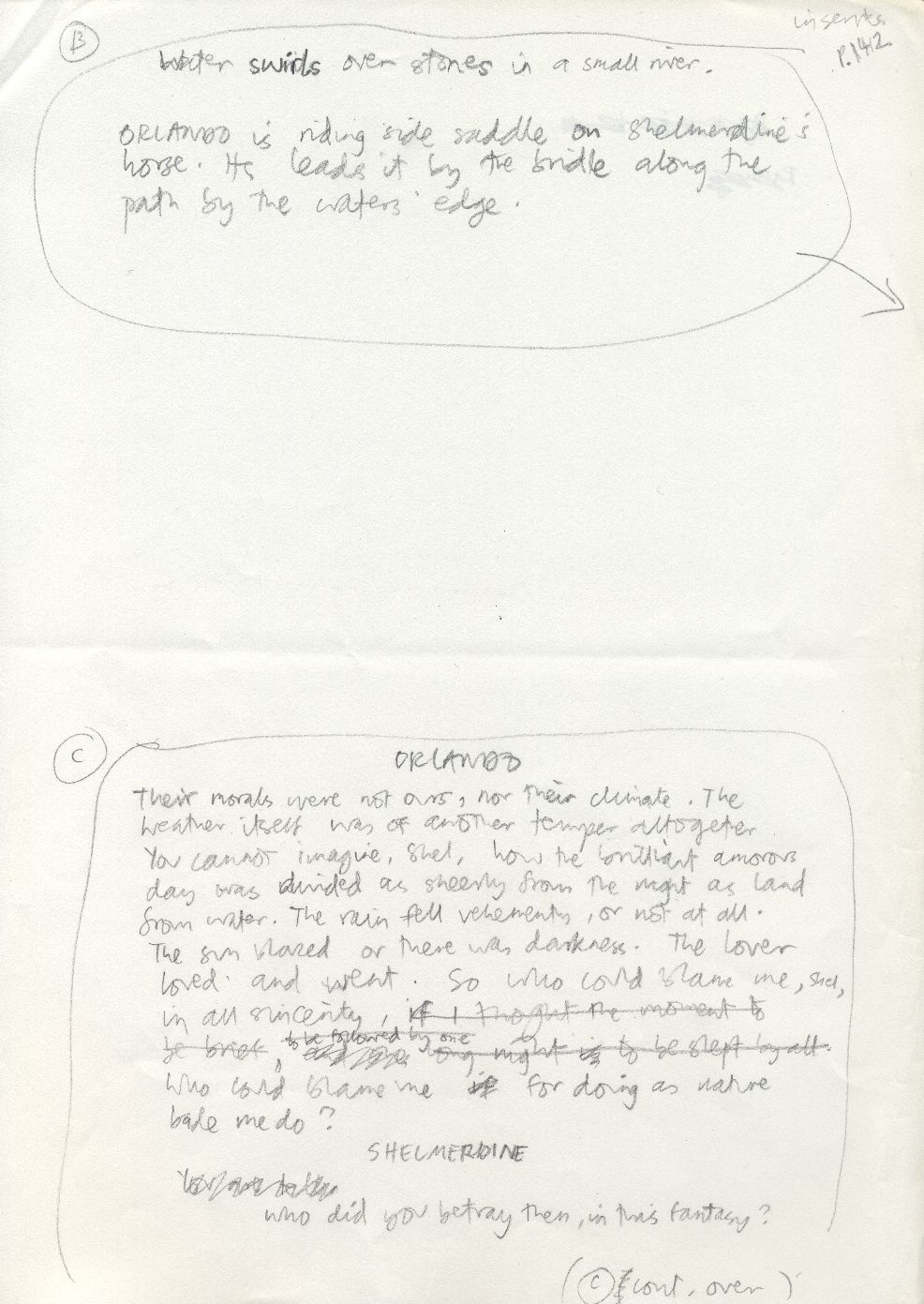Description Inserts for page 142 of second draft script for Orlando. Handwritten script with pencil on A4 paper bound with a plastic comb spine.