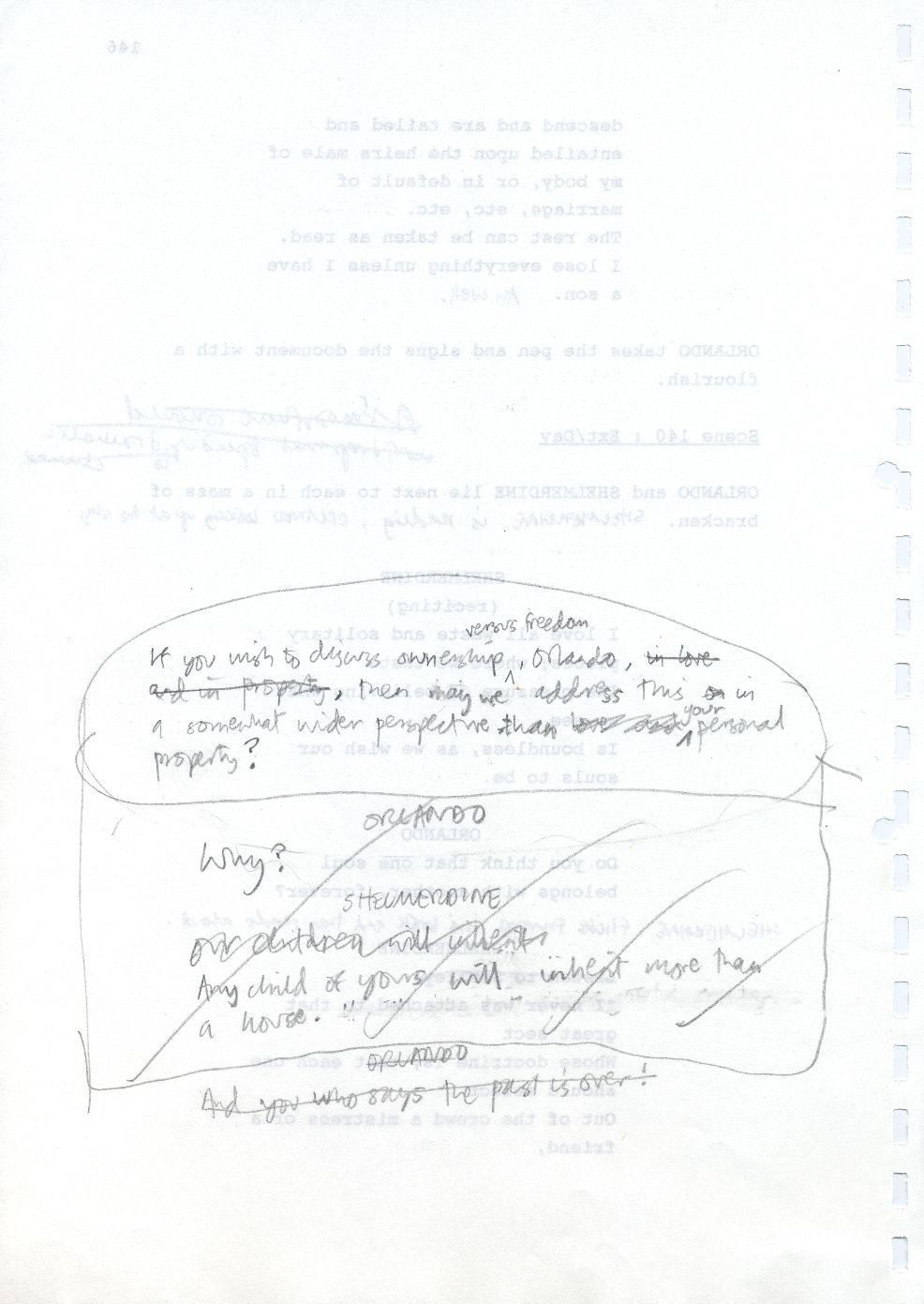 Description Reverse of page 146 of second draft script for Orlando. Handwritten script with pencil on A4 paper bound with a plastic comb spine,