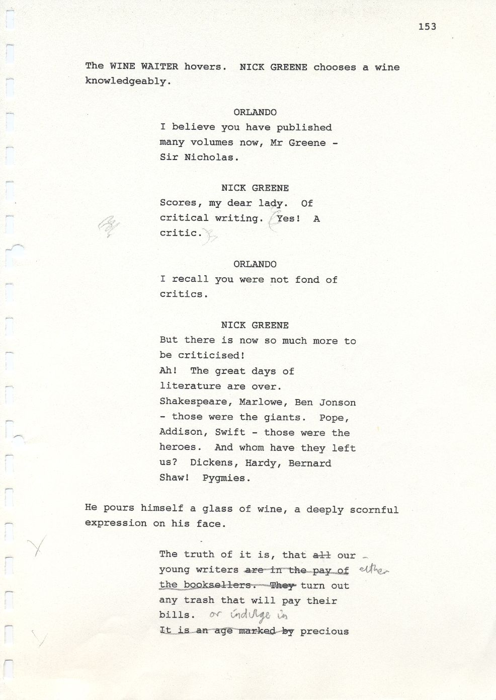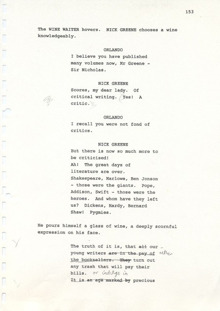 Description Page 153 of second draft script for Orlando. Black printed text with pencil annotations on A4 paper bound with a plastic comb spine.