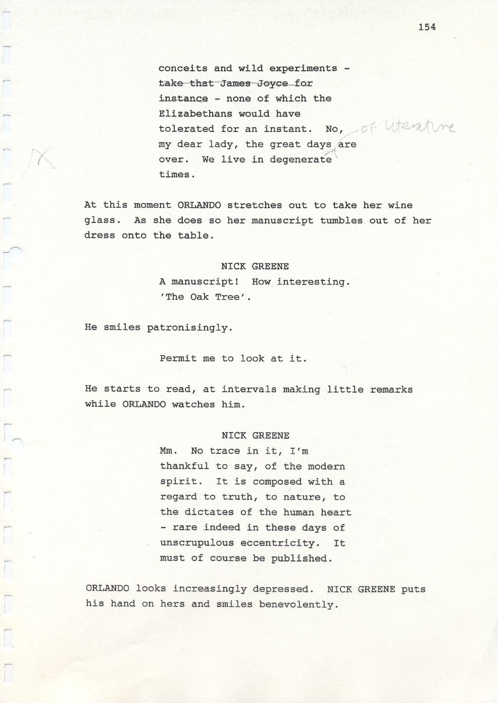 Description Page 154 of second draft script for Orlando. Black printed text with pencil annotations on A4 paper bound with a plastic comb spine.