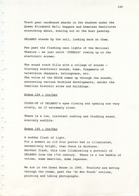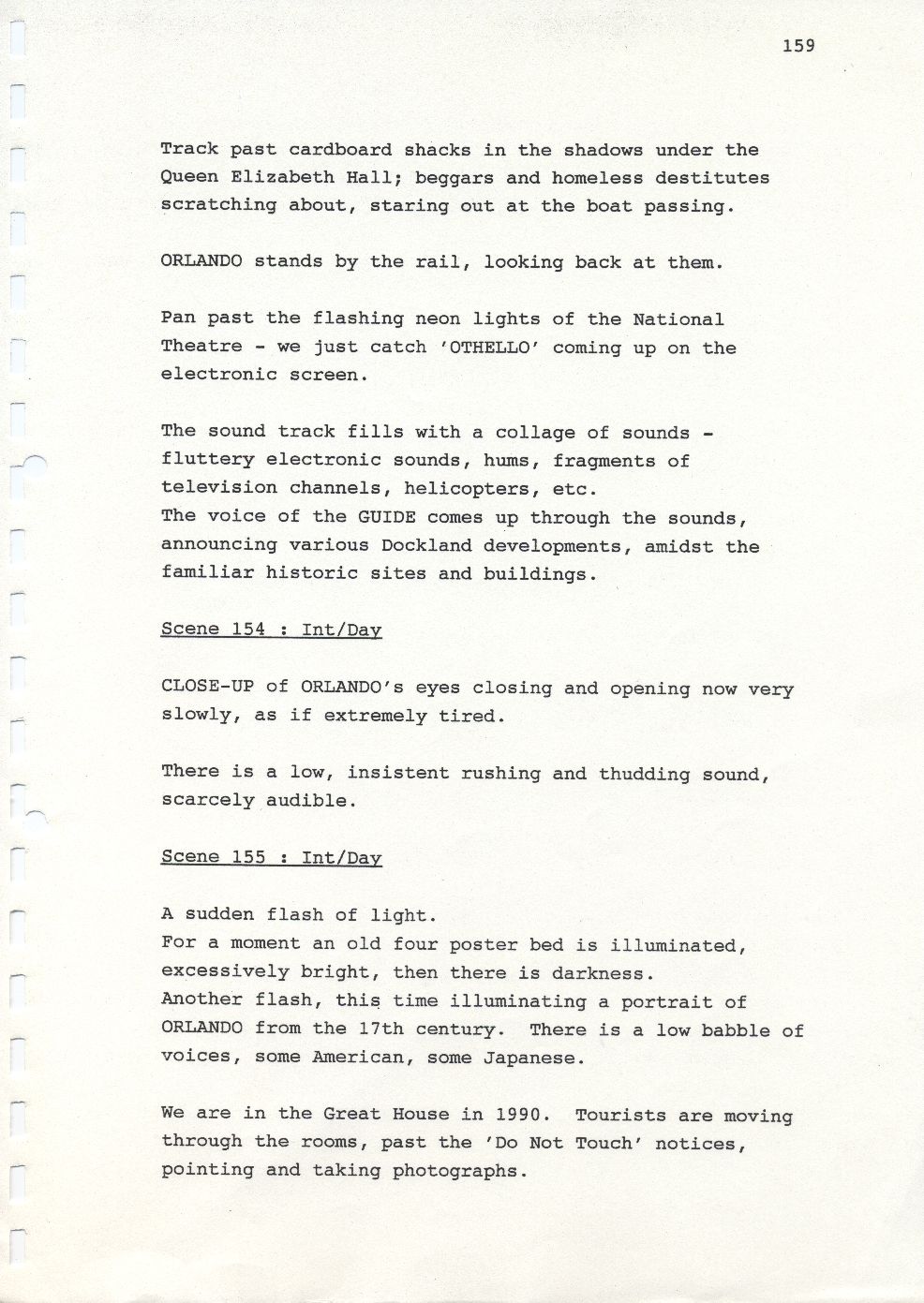 Description Page 159 of second draft script for Orlando. Black printed text with pencil annotations on A4 paper bound with a plastic comb spine.