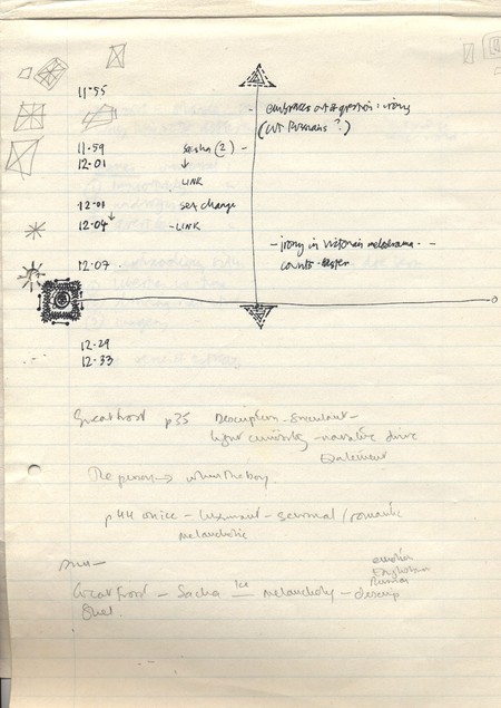 Description Page 3 of early developmental handwritten notes and ideas by Sally Potter and unknown on Orlando, black pen and pencil on A4 lined paper in pad