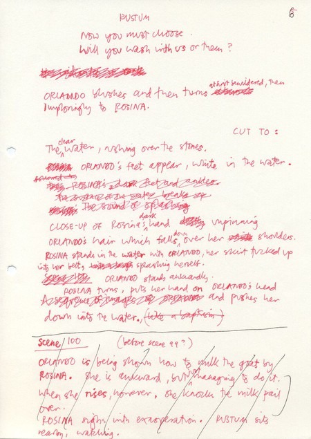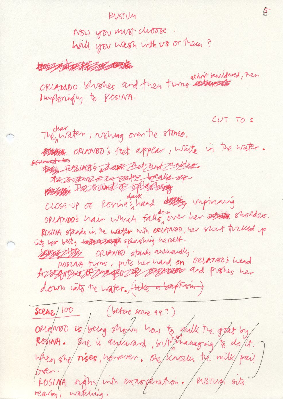 Description Page 6 of handwritten rough draft of scenes 99 and 100. Black and red ink on white A4. Attached to other sheets with paperclip