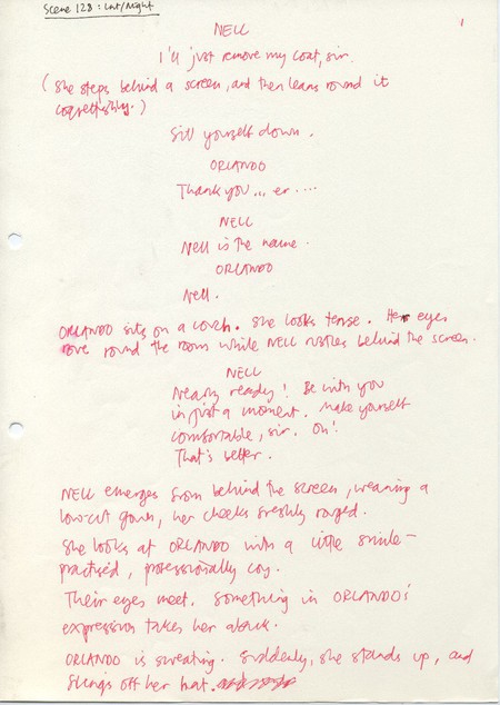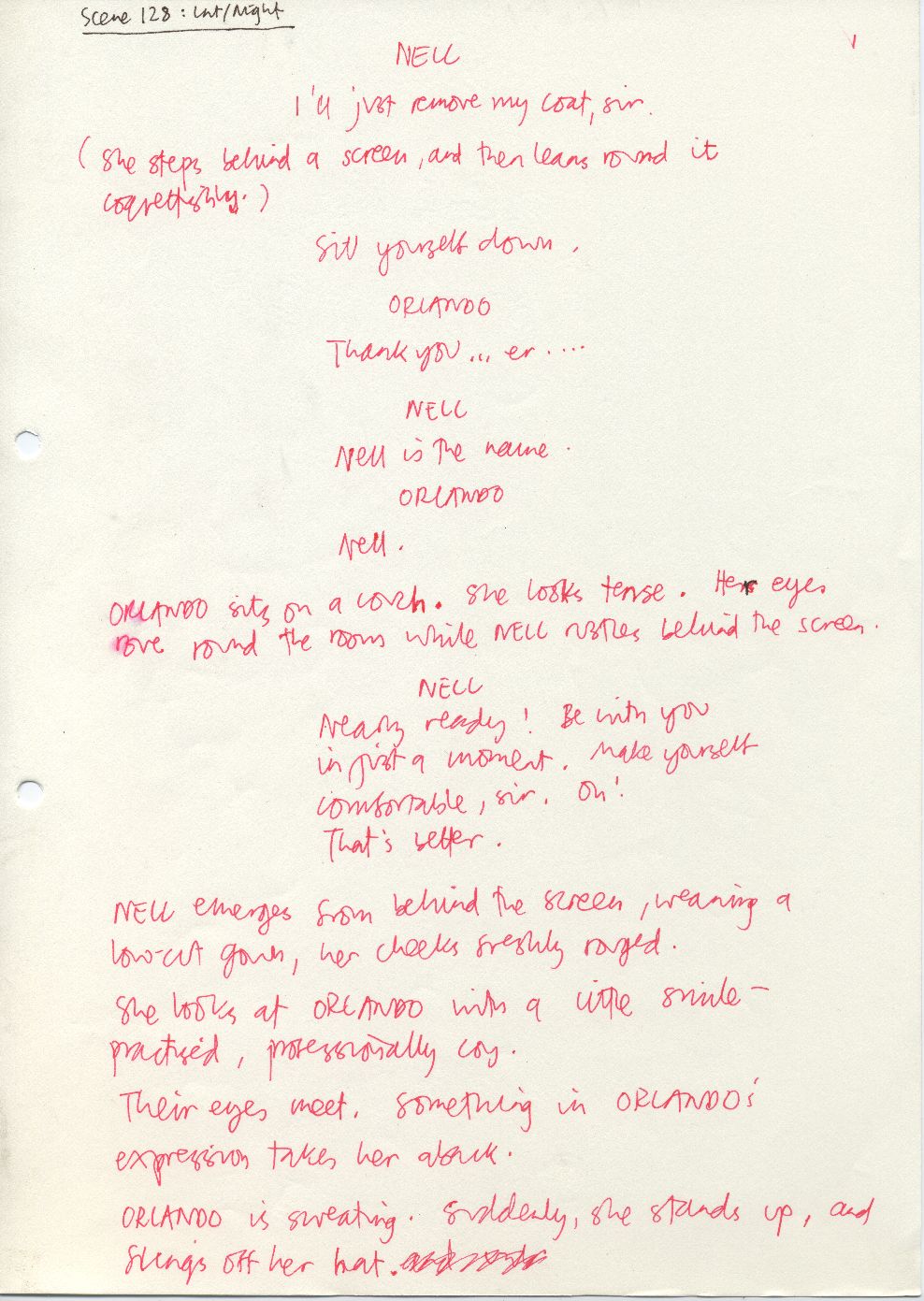 Description Page marked 1 of handwritten rough draft of scene 128. Black and red ink on white A4. Attached to other sheets with a paperclip