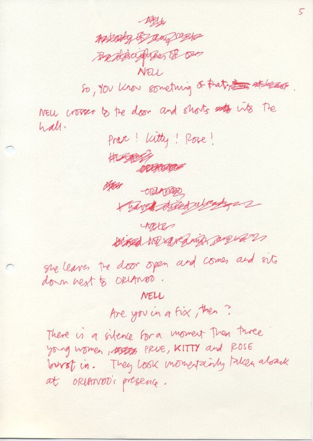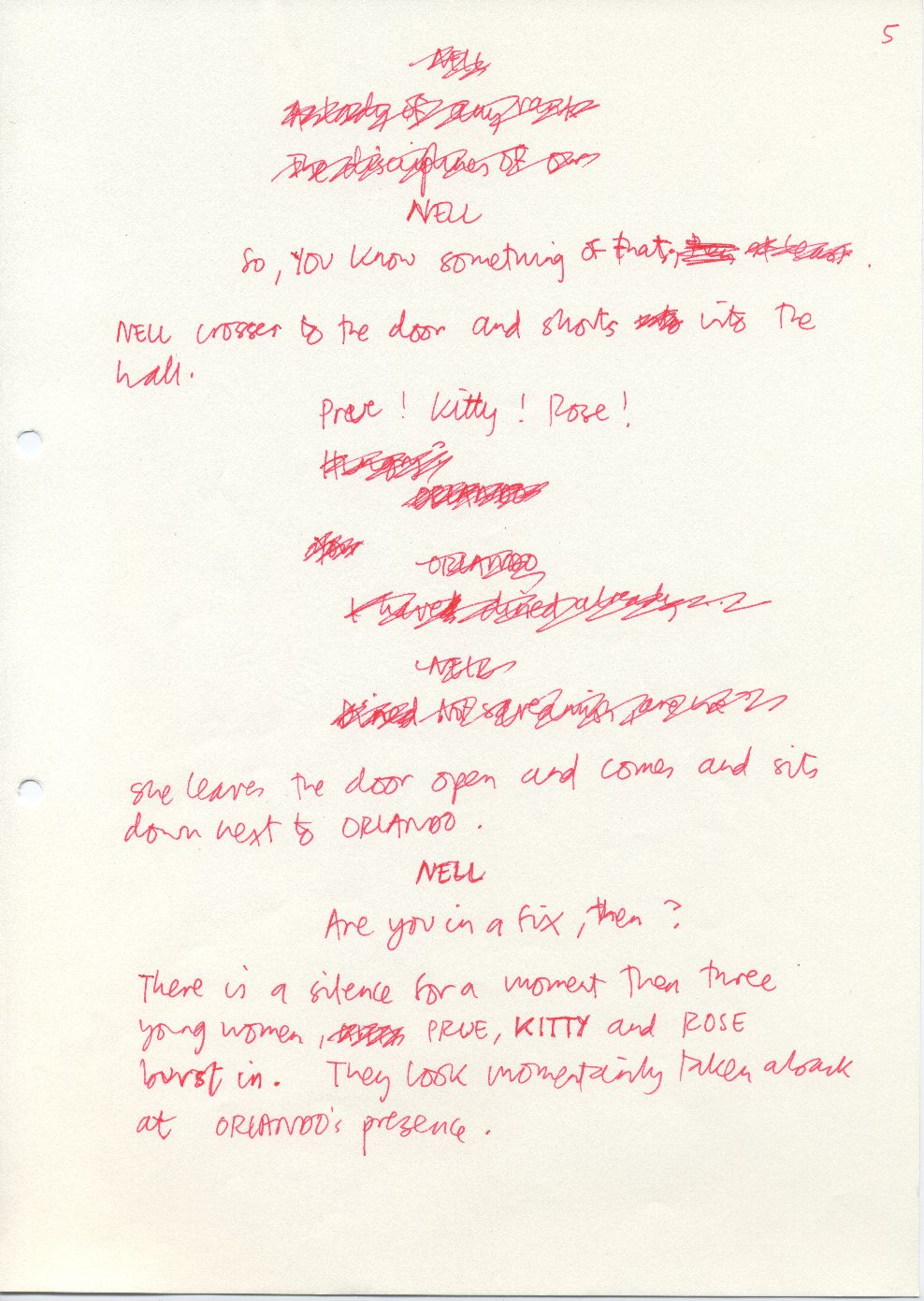 Description Page marked 5 of handwritten rough draft of scene 128. Red ink on white A4. Attached to other sheets with a paperclip