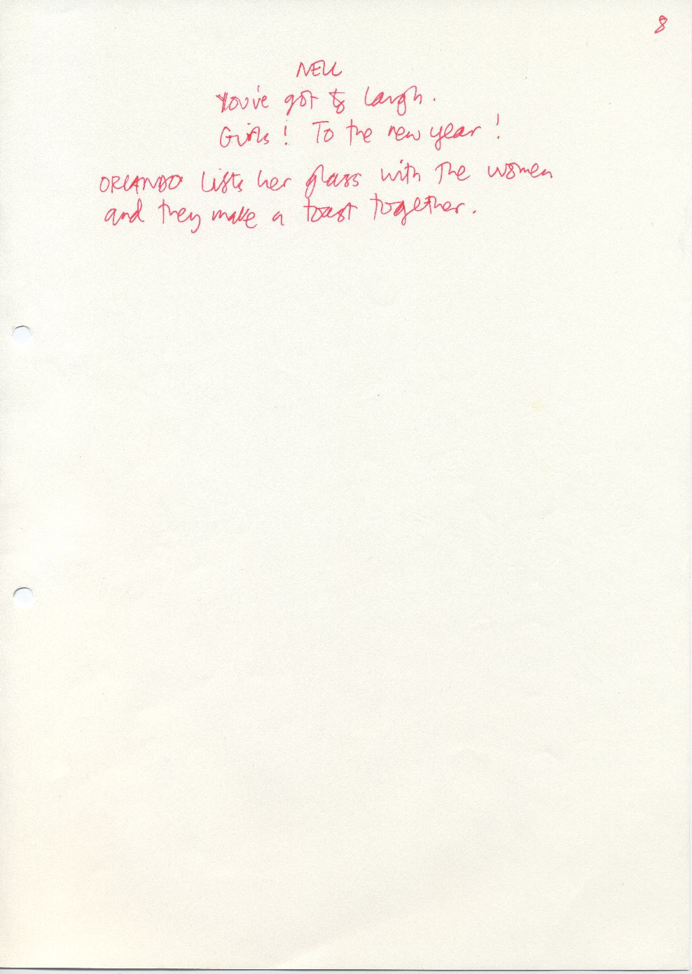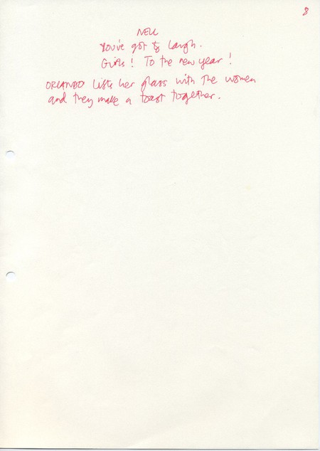 Description Page marked 8 of handwritten rough draft of scene 128. Red ink on white A4. Attached to other sheets with a paperclip