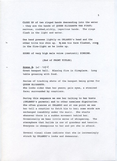 Description Page 5 of rough draft of scene 3 and scene 4. Black text on white A4 with pen annotations.