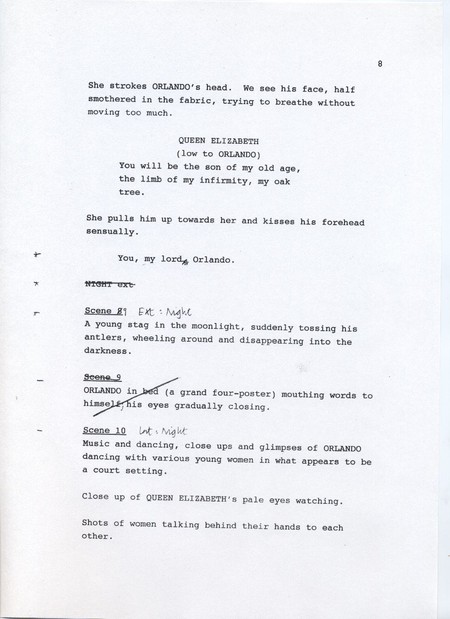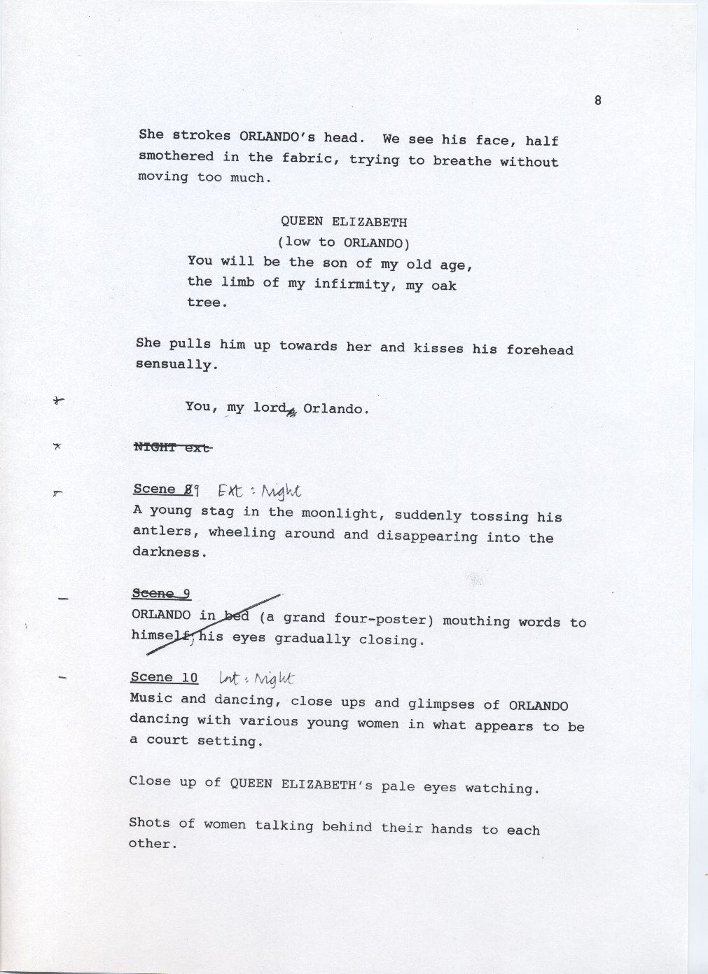 Description Page 8 of rough draft of scene 8, scene 9, scene 10. Back text on white A4 with pen annotations.
