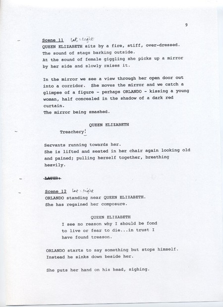 Description Page 9 of rough draft of scene 11, scene 12. Black text on white A4 with pen annotations.
