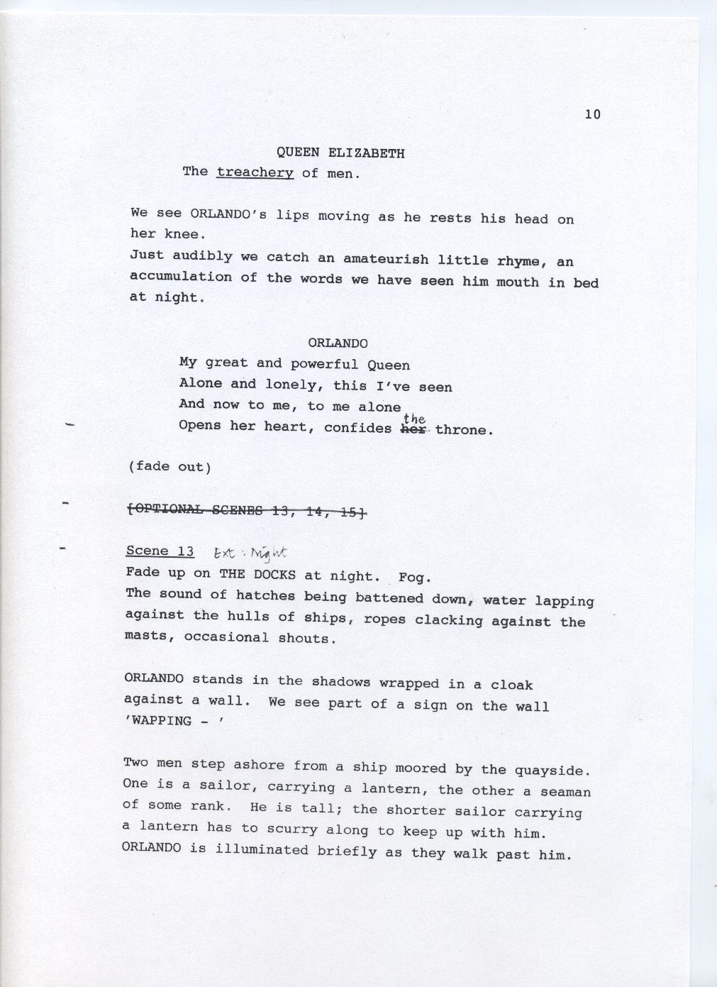 Description Page 10 of rough draft of scene 12, scene 13. Black text on white A4 with pen annotations.