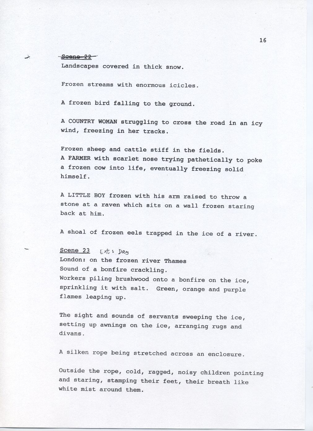 Description Page 16 of rough draft of scene 22, scene 23. Black text on white A4 with pen annotations.