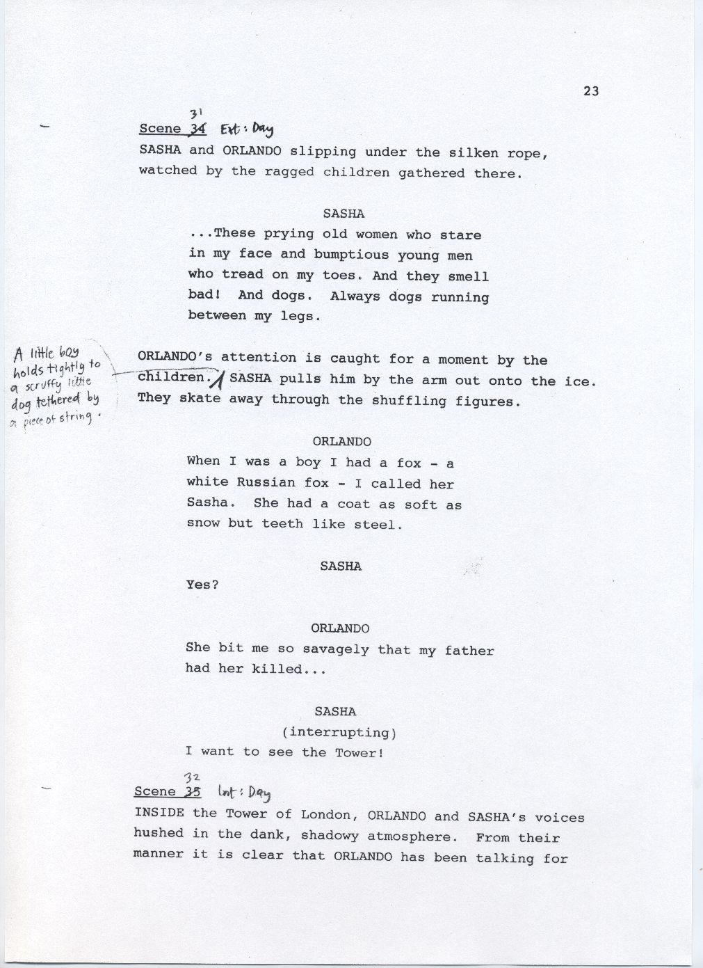 Description Page 23 of rough draft of scene 31, scene 32. Black text on white A4 with pen annotations.