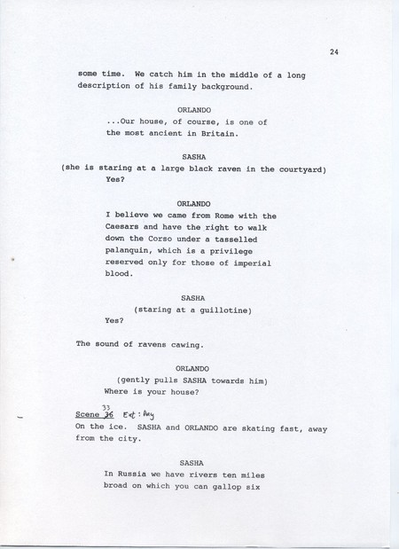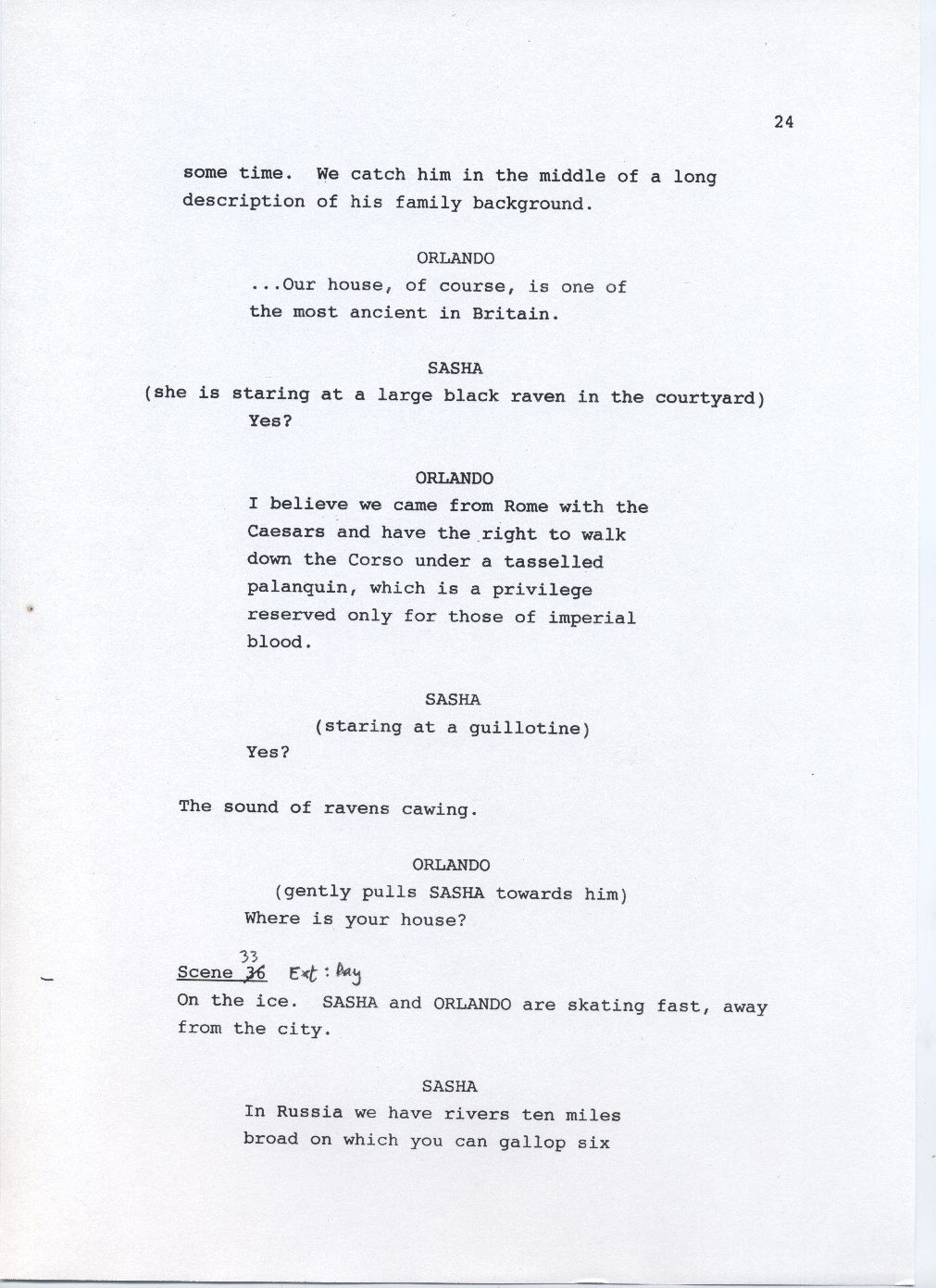 Description Page 24 of rough draft of scene 32, scene 33. Black text on white A4 with pen annotations.