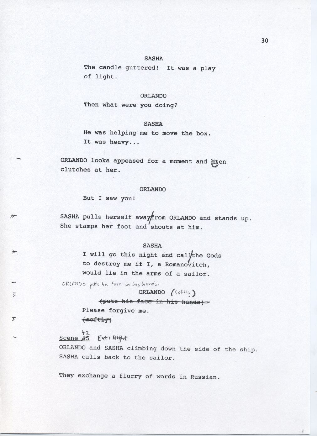 Description Page 30 of rough draft of scene 41, scene 42. Black text on white A4 with pen annotations.