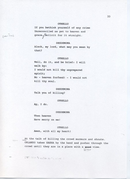 Description Page 33 of rough draft of scene 44. Black text on white A4 with pen annotations.
