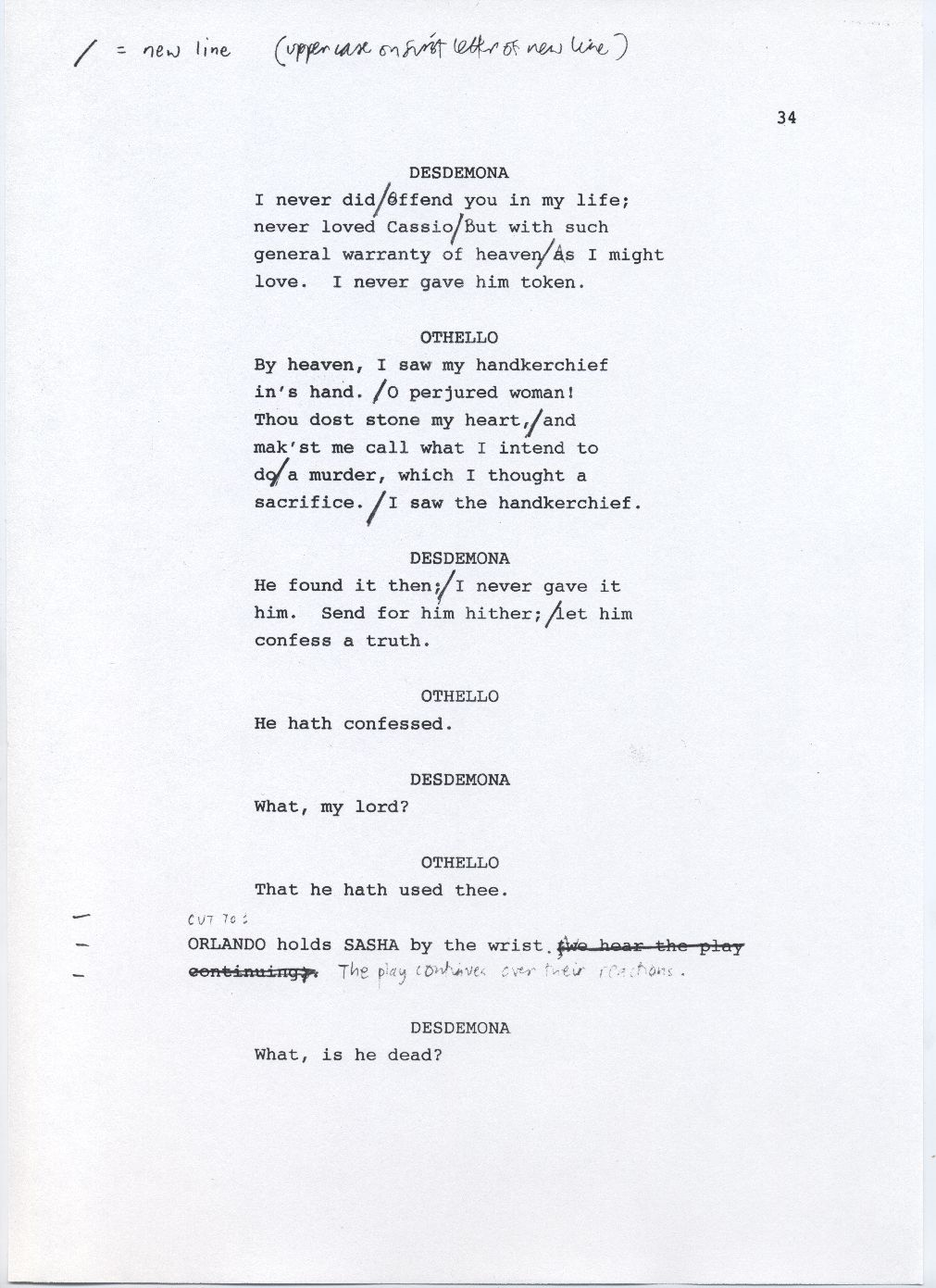Description Page 34 of rough draft of scene 44. Black text on white A4 with pen annotations.