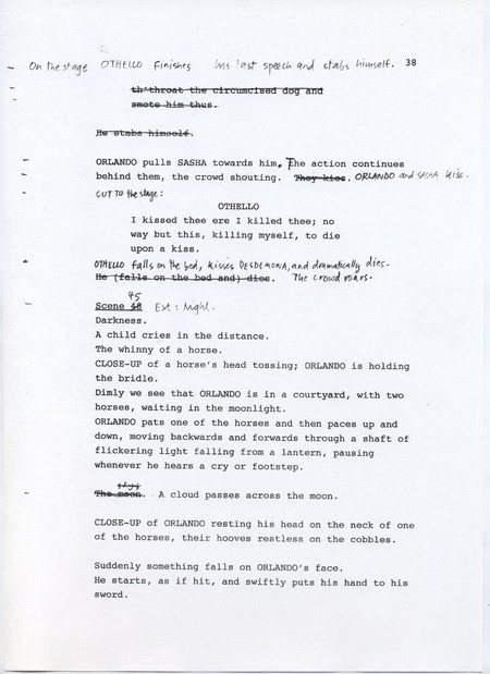 Description Page 38 of rough draft of scene 44, scene 45. Black text on white A4 with pen annotations.