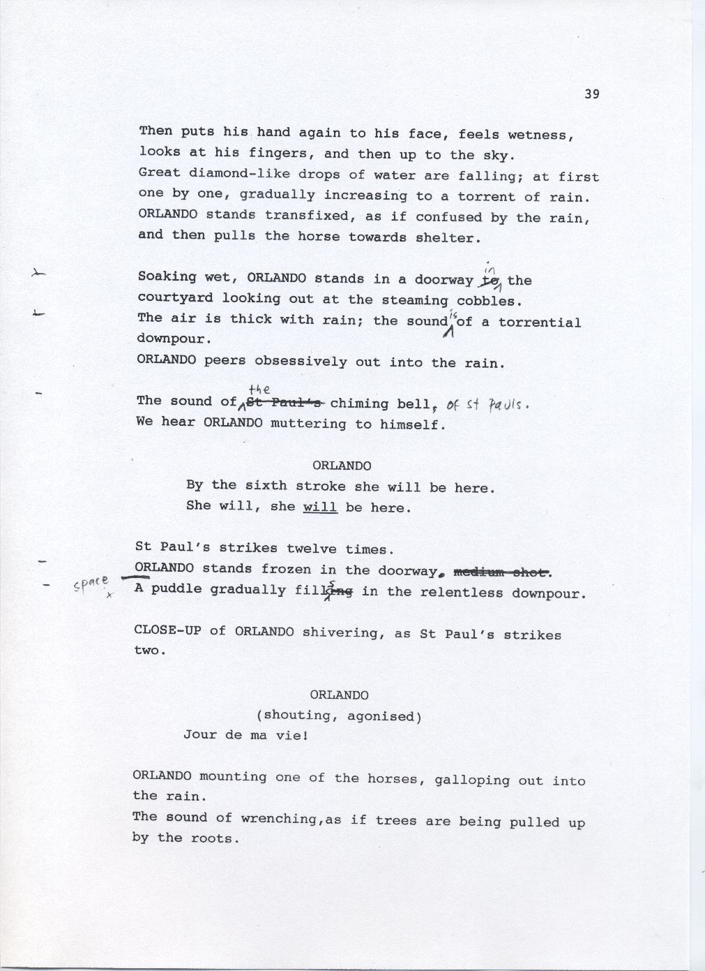 Description Page 39 of rough draft of scene 45. Black text on white A4 with pen annotations.