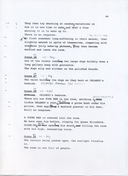 Description Page 44 of rough draft of scene 52, scene 53, scene 54, scene 55, scene 56. Black text on white A4 with pen annotations.