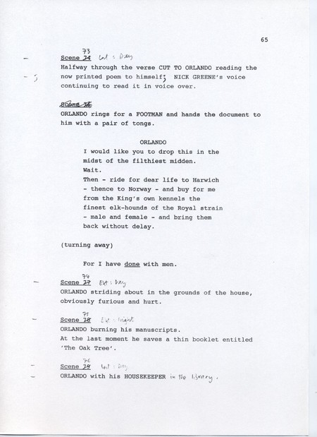 Description Page 65 of rough draft of scene 73, scene 74, scene 75, scene 76. Black text on white A4 with pen annotations.