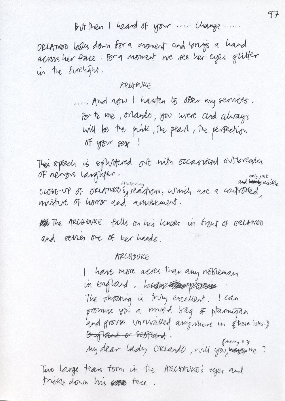 Description Page 97 of rough draft of scene 113. Hand written in black ink with pen annotations.