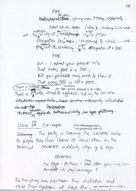 Description Page 108 of rough draft of scene 119, scene 120. Hand written in black ink with annotations.