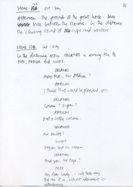 Description Page 111 of rough draft of scene 122, scene 123. Hand written in black ink with pen annotations.
