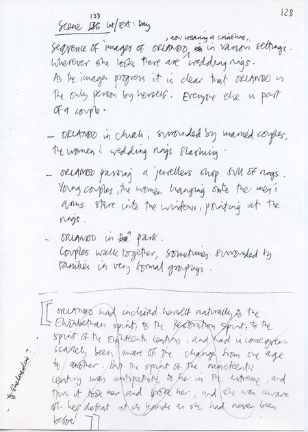 Description Page 128 of rough draft of scene 133. Hand written in black ink with pen annotations.