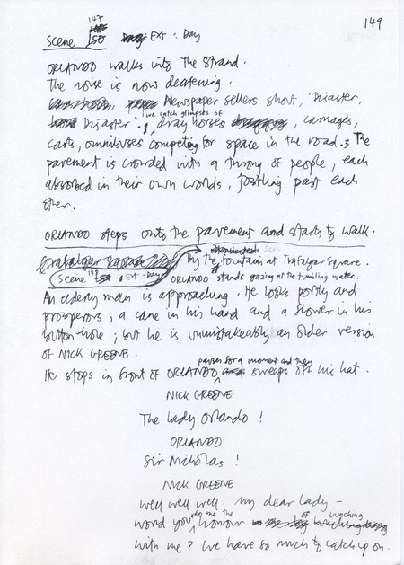Description Page 149 of rough draft of scene 147, scene 148. Hand written in black ink with pen annotations.