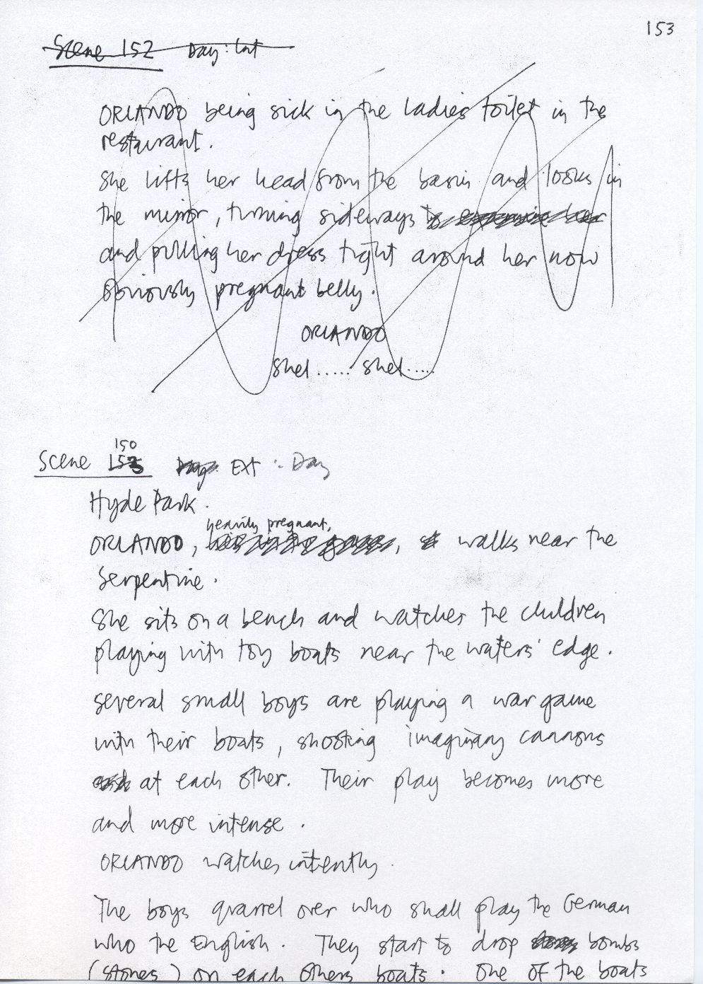 Description Page 153 of rough draft of scene 150. Hand written in black ink with pen annotations.
