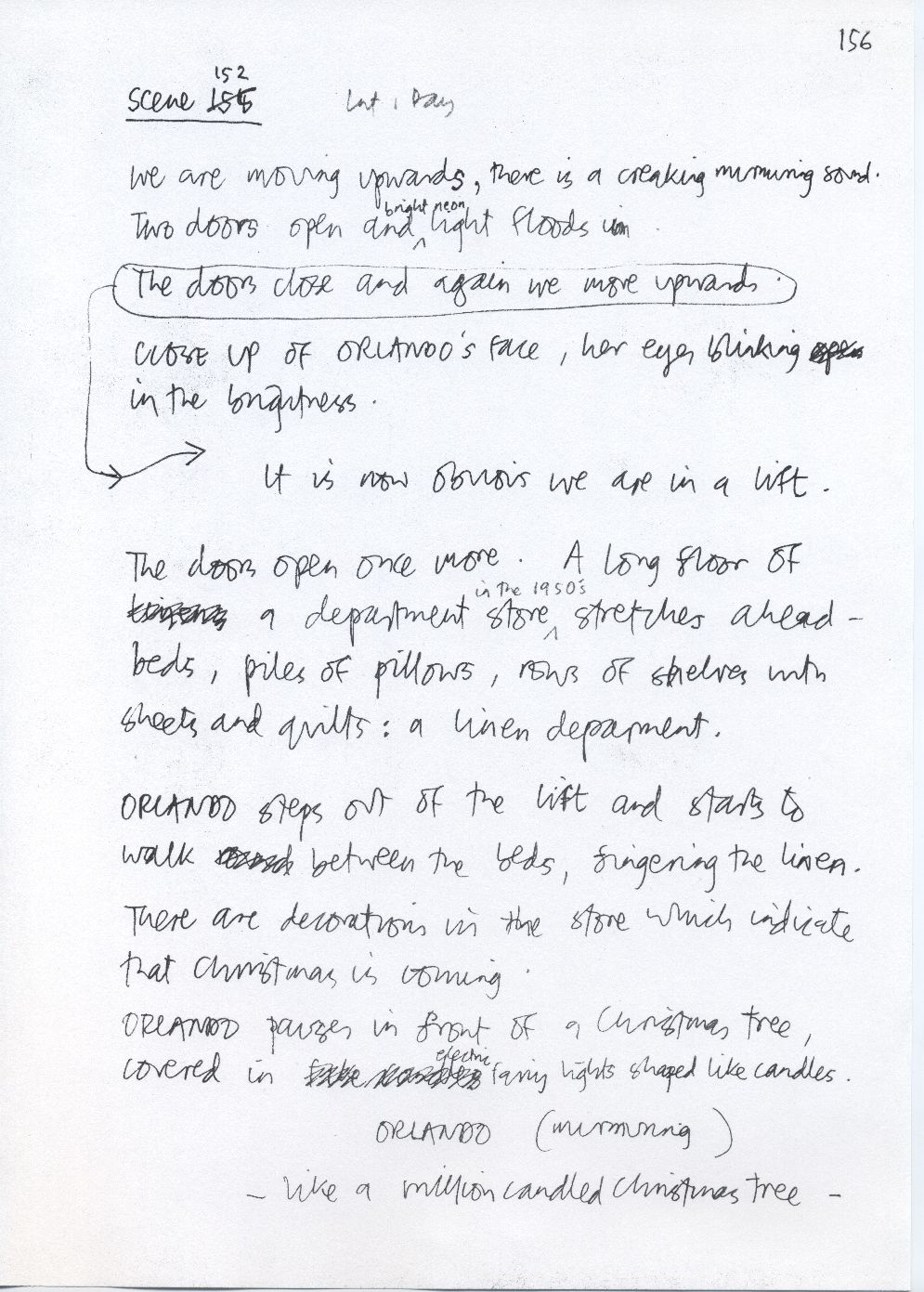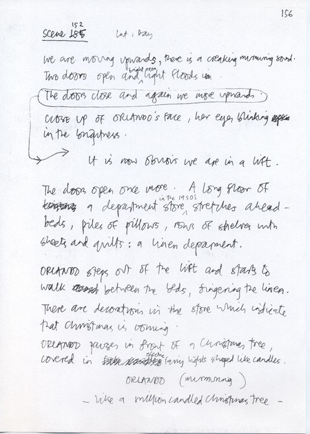 Description Page 156 of rough draft of scene 152. Hand written in black ink with pen annotations.