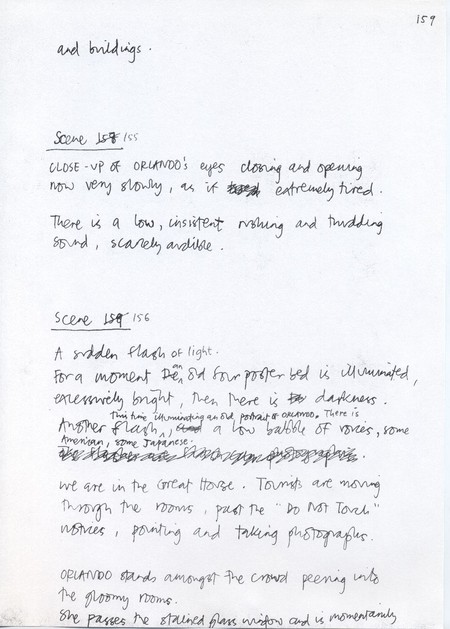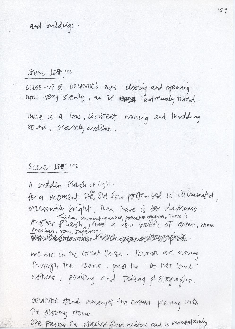 Description Page 159 of rough draft of scene 155, scene 156. Hand written in black ink with pen annotations.