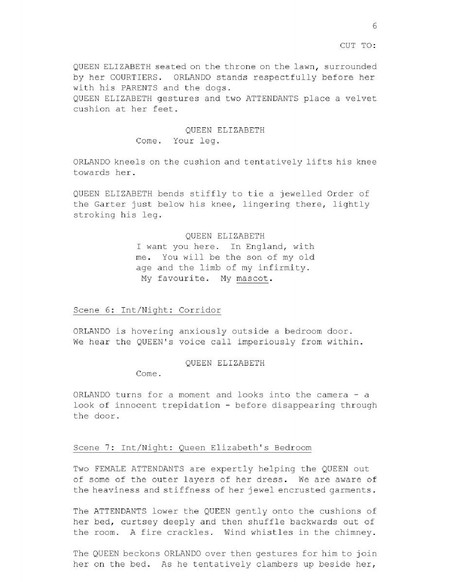 Initially, Sally Potter had the narrative of Orlando living each moment as the present. For instance Orlando in 1592, tells the story as if it were 1592; the Orlando in 1700 tells the story as if it were 1700, etc. However, later this changed and bore more resemblance to Virginia Woolf's prose. The film took on the structure of memories, the present being 1992. Therefore, the narrative of the film did not alter with the aging/ developing of character. The narrator of the film is the female mother Orlando, and thereby tone and language differs from the language of a young boy. In the part of "Death" we can see many differences between Potter's shooting script and the finalized version in her process of adapting Virginia Woolf's novel "Orlando".