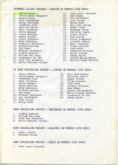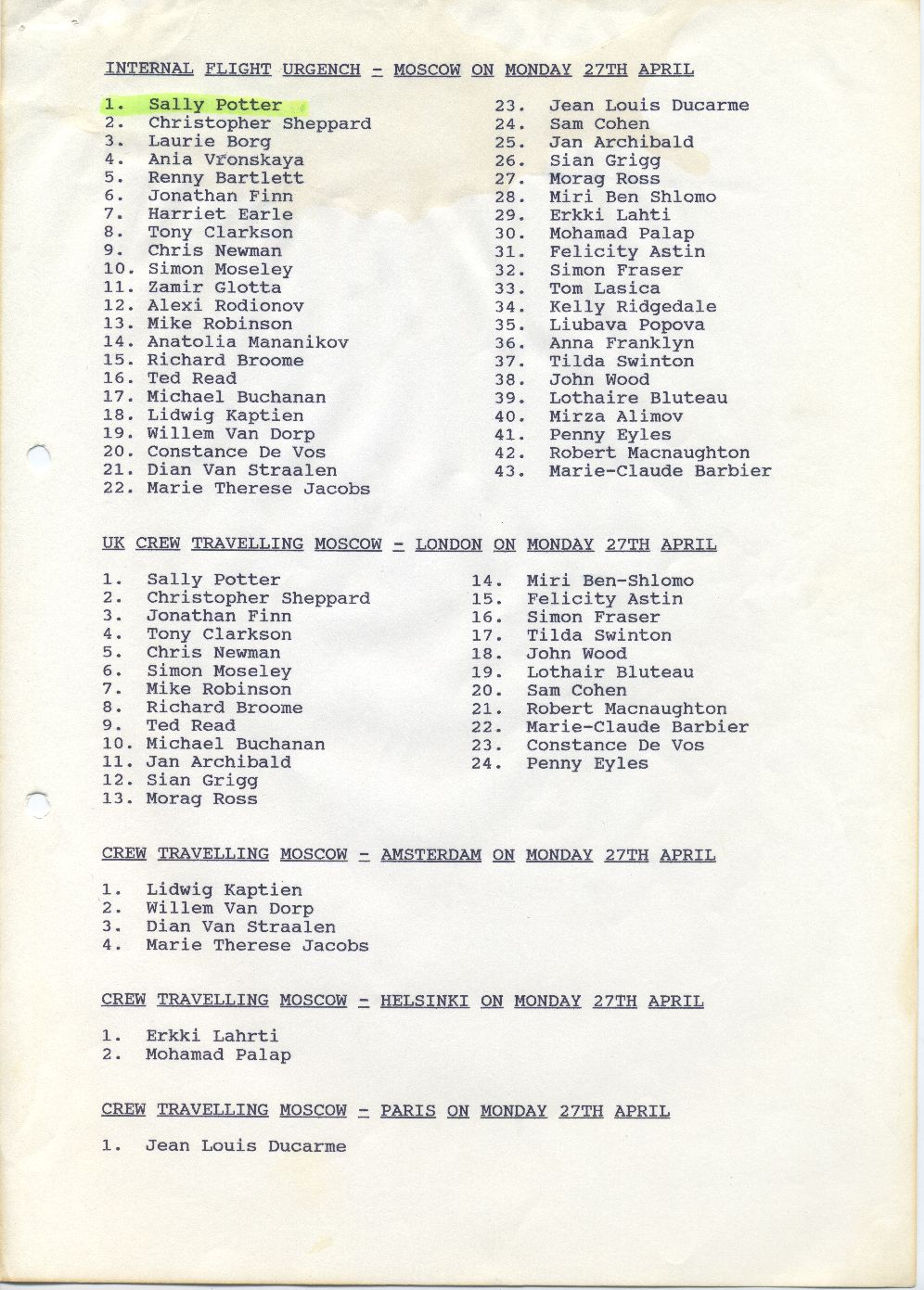 Description Page 1, typed A4 sheet showing flight arrangements from Urgench to Moscow and Moscow to London, Amsterdam, Helsinki and Paris