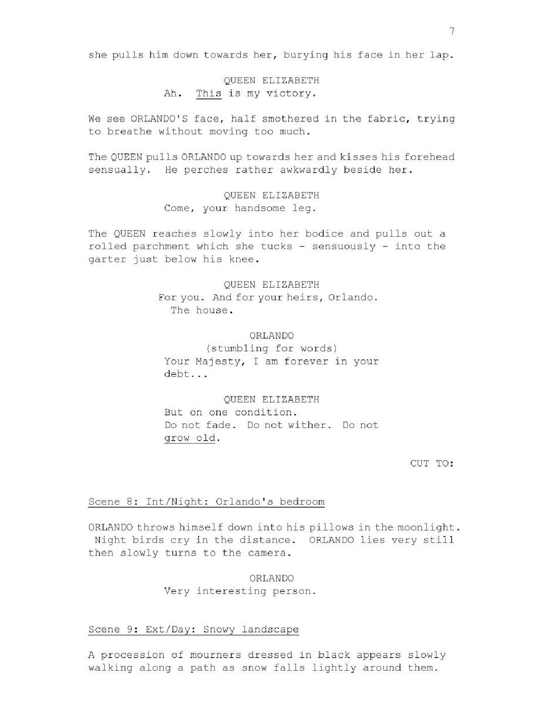 Initially, Sally Potter had the narrative of Orlando living each moment as the present. For instance Orlando in 1592, tells the story as if it were 1592; the Orlando in 1700 tells the story as if it were 1700, etc. However, later this changed and bore more resemblance to Virginia Woolf's prose. The film took on the structure of memories, the present being 1992. Therefore, the narrative of the film did not alter with the aging/ developing of character. The narrator of the film is the female mother Orlando, and thereby tone and language differs from the language of a young boy. In the part of "Death" we can see many differences between Potter's shooting script and the finalized version in her process of adapting Virginia Woolf's novel "Orlando".