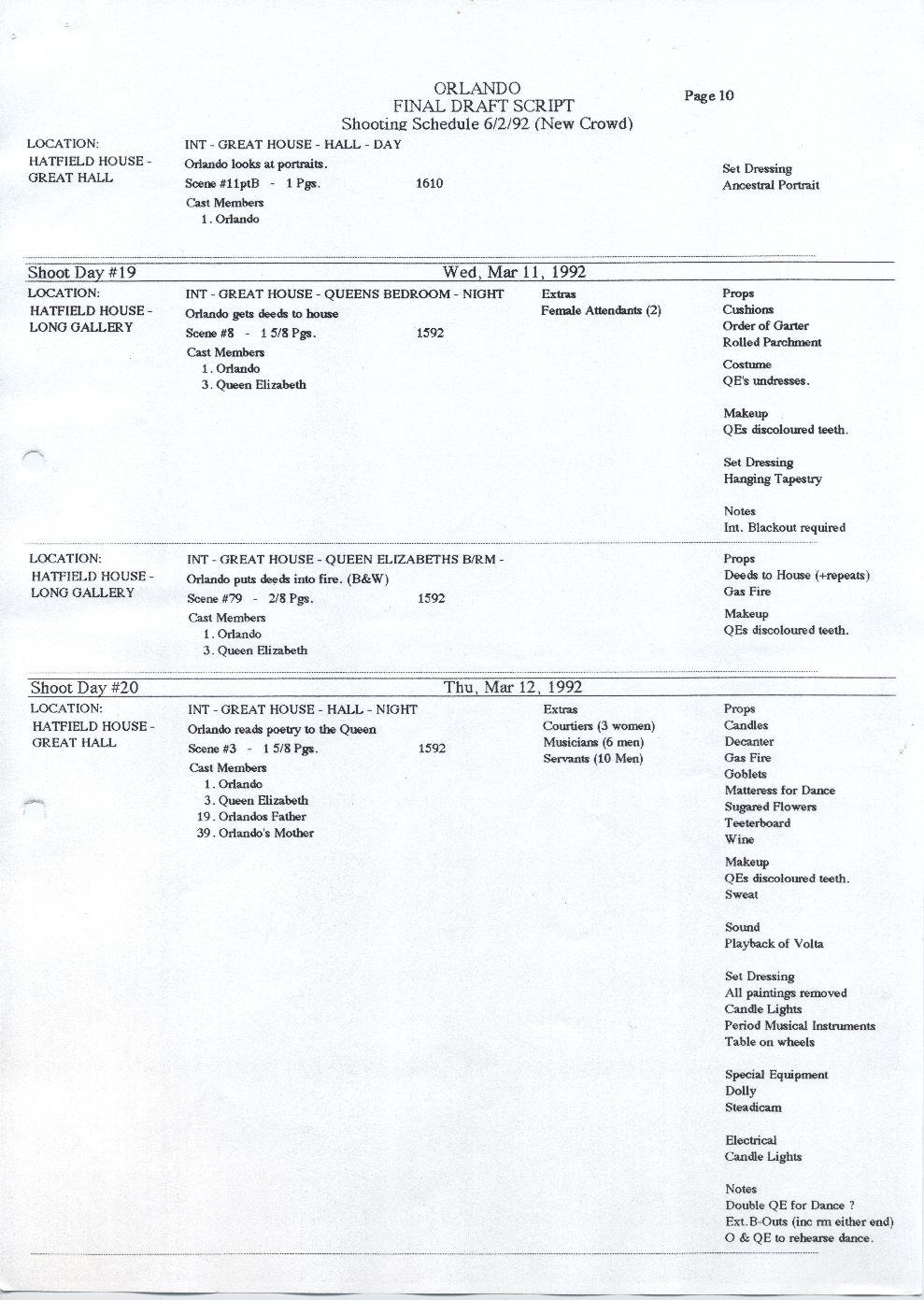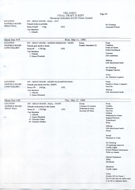 Description Page 10 of shooting schedule. A4 computer printed sheet