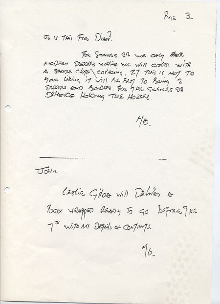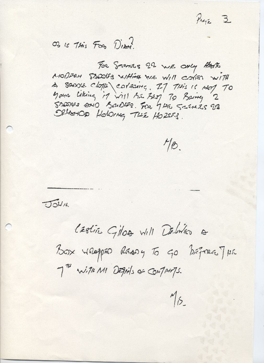 Description Page 3 of letter discussing set design. A4 hand written sheet.