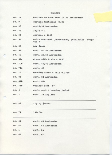 Description Page 2 of Orlando's costumes by location. Typed A4 sheet.