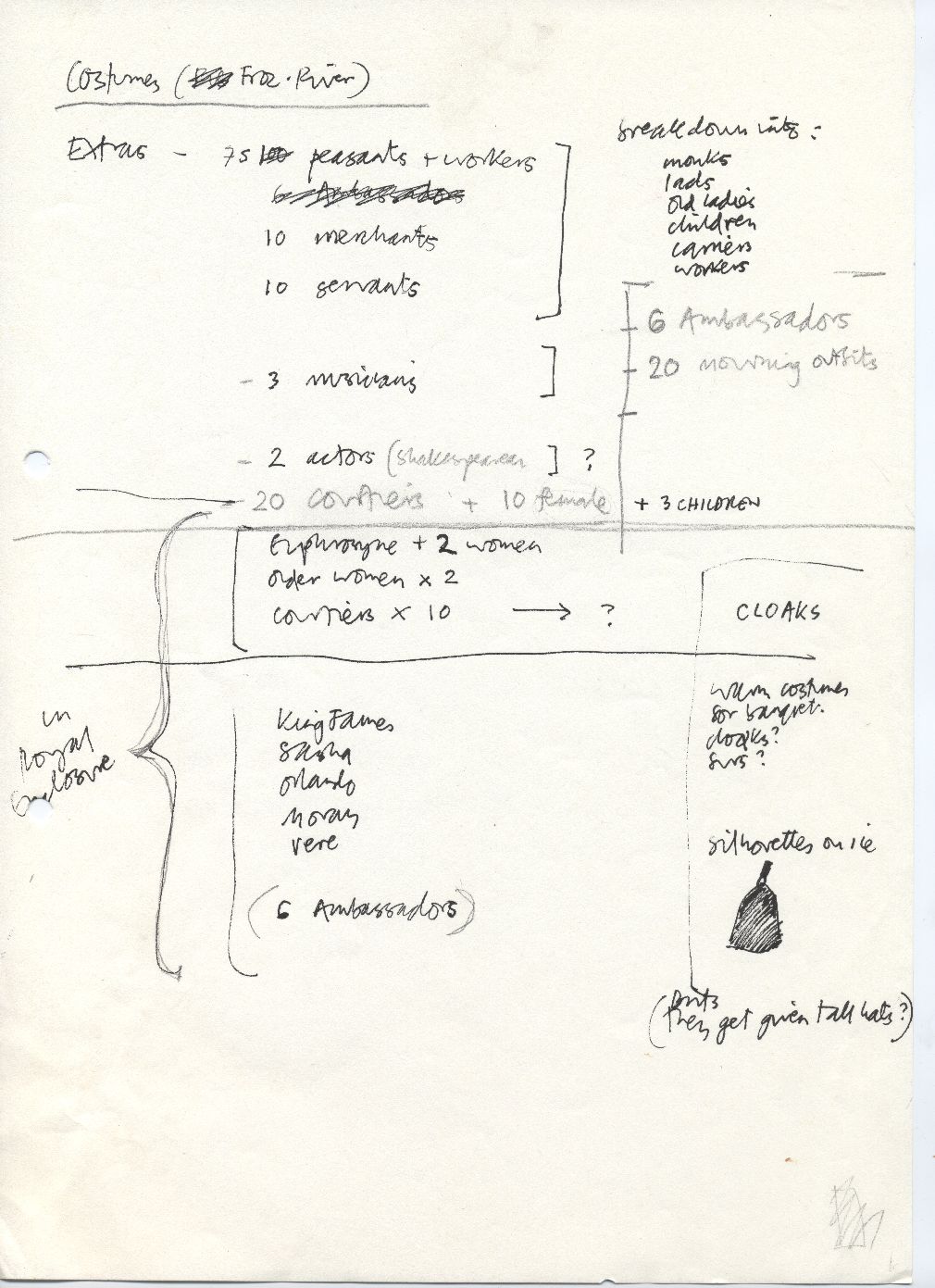 Description Costumes for frozen river scene. Hand written A4 sheet.