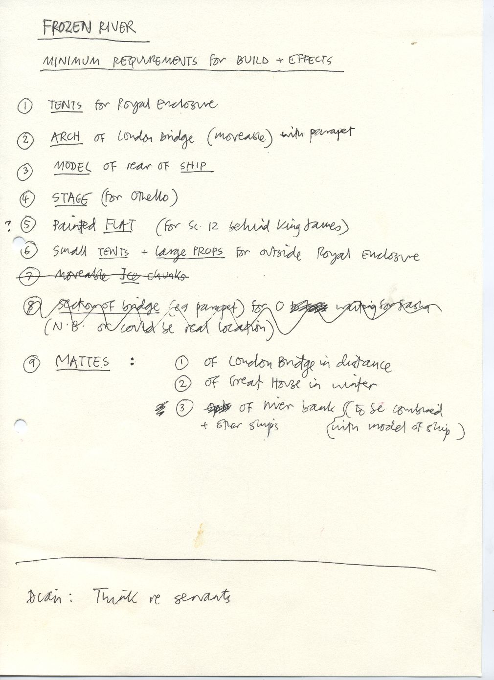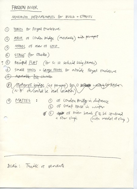 Description Minimum requirements for build and effects for frozen river scene. Hand written A4 page.