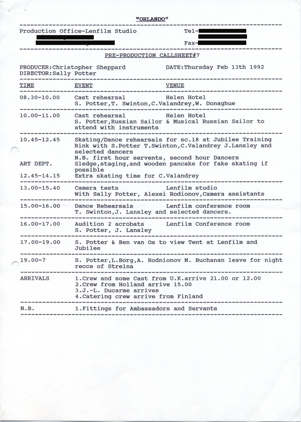 Description Pre-production call sheet #7. Typed A4 sheet
