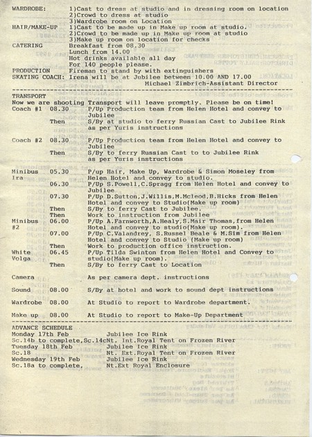 Description Reverse of production call sheet #1. Typed A4 sheet