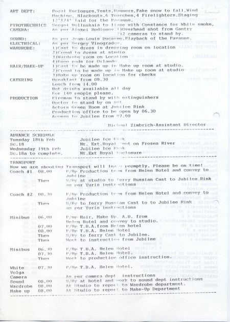 Description Reverse of production call sheet #3. Typed A4 sheet.