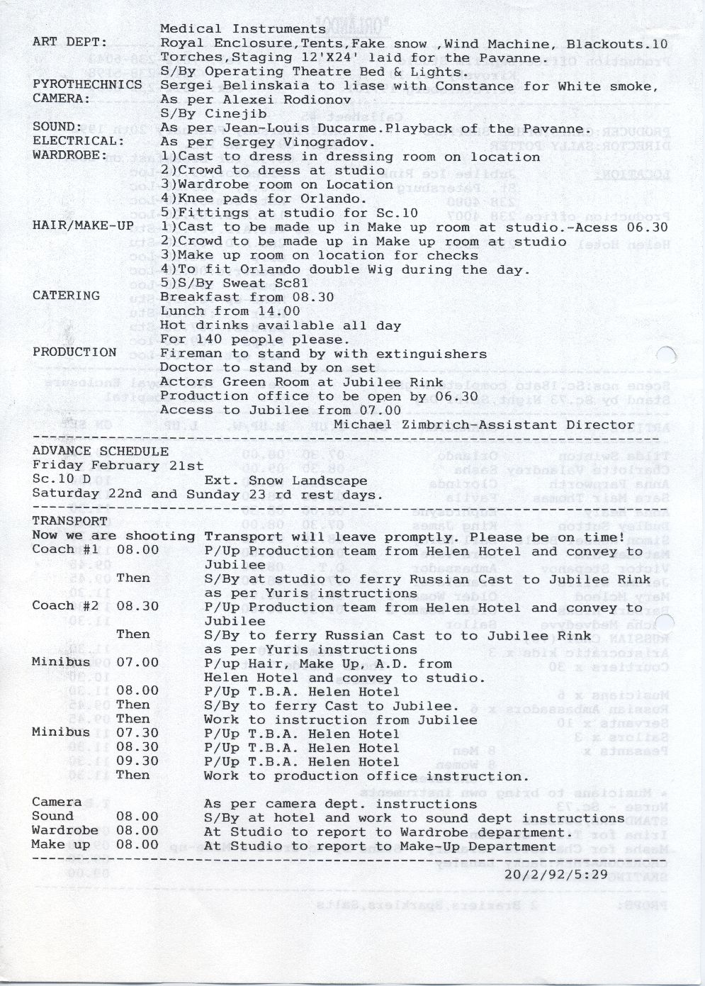 Description Reverse of production call sheet #5. Typed A4 sheet