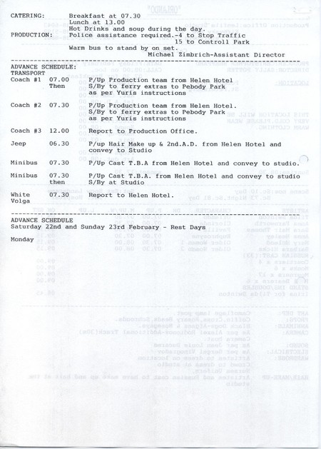 Description Reverse of production call sheet #6 Typed A4 sheet