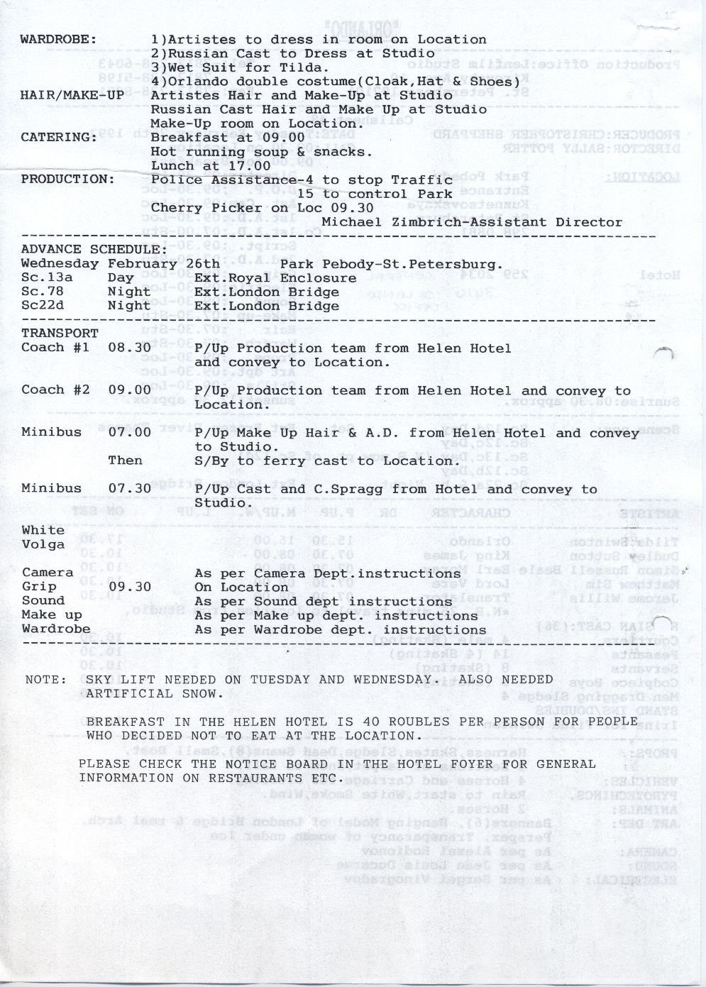 Description Reverse of production call sheet # 8. Typed A4 sheet
