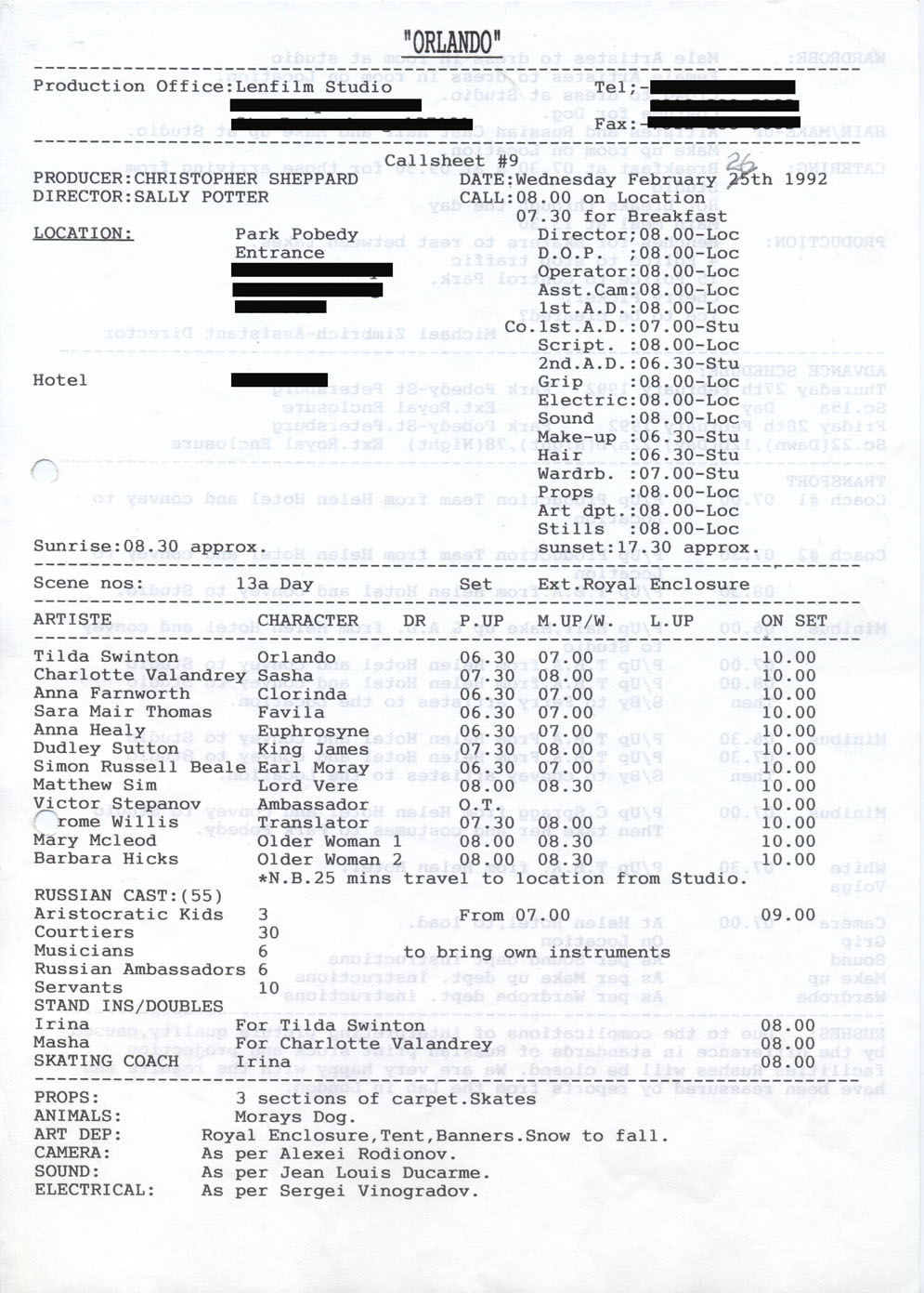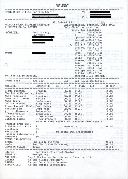 Description Production call sheet #9. Typed A4 sheet with pencil corrections